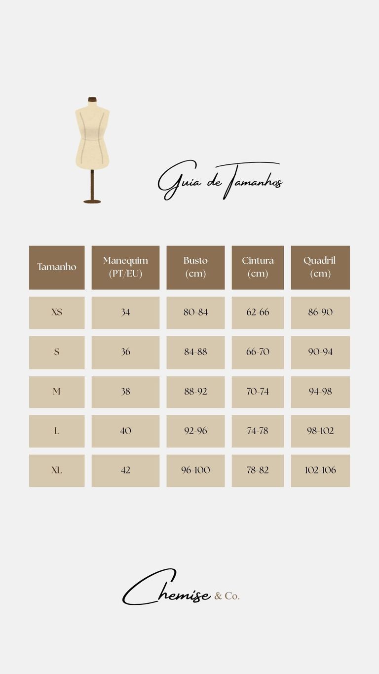 Armazenamento: Guarde-a dobrada ou pendurada por cabides de veludo para evitar marcas permanentes no cós.